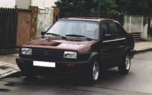Haaren und ein dunkelbrauner oder dunkelroter VW Jetta II mit beginnendem